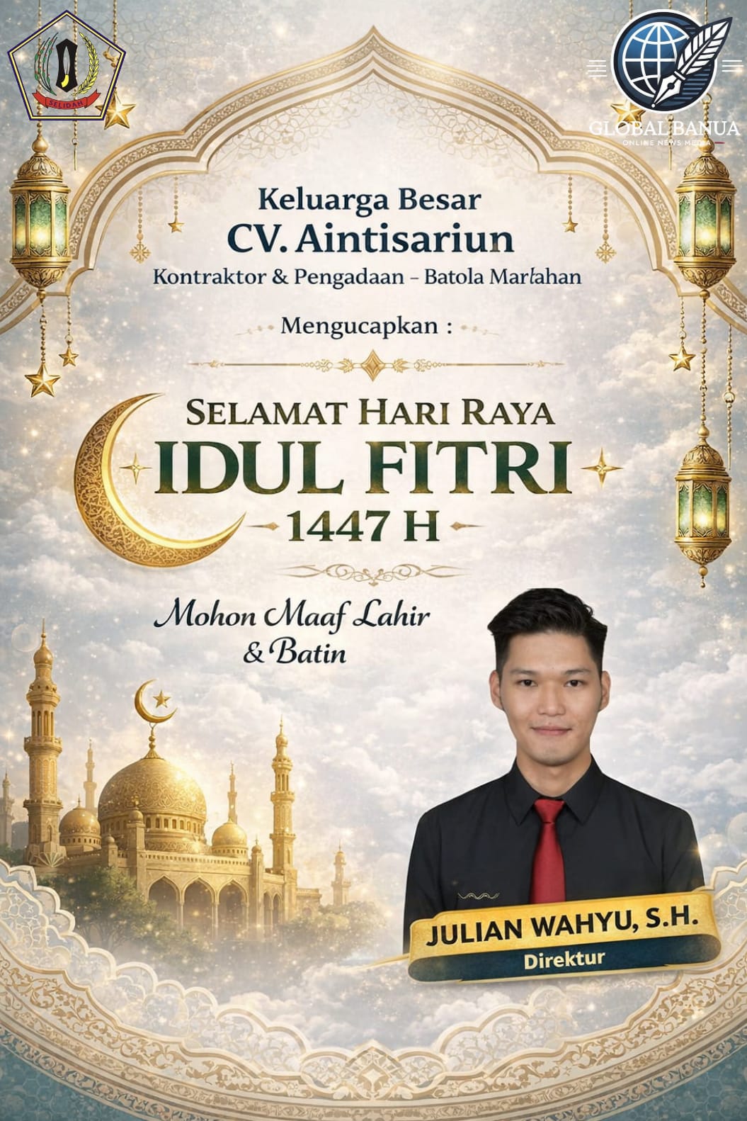 Ucapan mitra Keluarga Besar CV. Aintisariun Kontraktor & Pengadaan – Batola Marłahan Mengucapkan : SELAMAT HARI RAYA IDUL FITRI -1447 H admin 20 Maret 2026 Keluarga Besar CV. Aintisariun Kontraktor & Pengadaan – Batola Marłahan Mengucapkan : SELAMAT HARI RAYA IDUL FITRI -1447 H Related Posts:Hari Jadi ke-66 Kabupaten Barito Kuala: Membangun…Bupati H. Bahrul Ilmi Laksanakan Sholat Idul Fitri…Jamkrida Kalsel Rayakan Idul Fitri 2026, Perkuat…JAGA PERSATUAN DAN PERERAT SILATURAHMI DI HARI…KELUARGA BESAR KANTOR WILAYAH BPN PROVINSI…KELUARGA BESAR DINAS LH KAB. BARITO KUALA… Post Navigation Previous Keluarga Besar. DISBUNAK PEMKAB BARITO KUALA Mengucapkan : Selamat Hari Raya IDHUL FITRI 1447 H Mohon Maaf Lahir & BatinNext KELUARGA BESAR BADAN PENGELOLAAN PAJAK DAN RETRIBUSI DAERAH KABUPATEN BARITO KUALA MENGUCAPKAN : Selamat Hari Hari Raya Idhul Fitri 1447 Η Berita Lainnya Artikel Berita Daerah Hukum Pemerintahan Ucapan mitra Marabahan, Kabupaten Barito Kuala Jadi Tuan Rumah MTQ Tingkat Provinsi Kalsel 2026 admin 8 April 2026 Artikel Berita Daerah Hukum Pemerintahan Ucapan mitra FINALISASI RAPERBUP UPTD KLINIK UTAMA SETARA, LANGKAH PERKUAT LAYANAN KESEHATAN DI BATOLA admin 2 April 2026 Artikel Berita Pemerintahan Ucapan mitra PEMKAB BATOLA GELAR HALAL BIHALAL IDUL FITRI 1447 H admin 30 Maret 2026